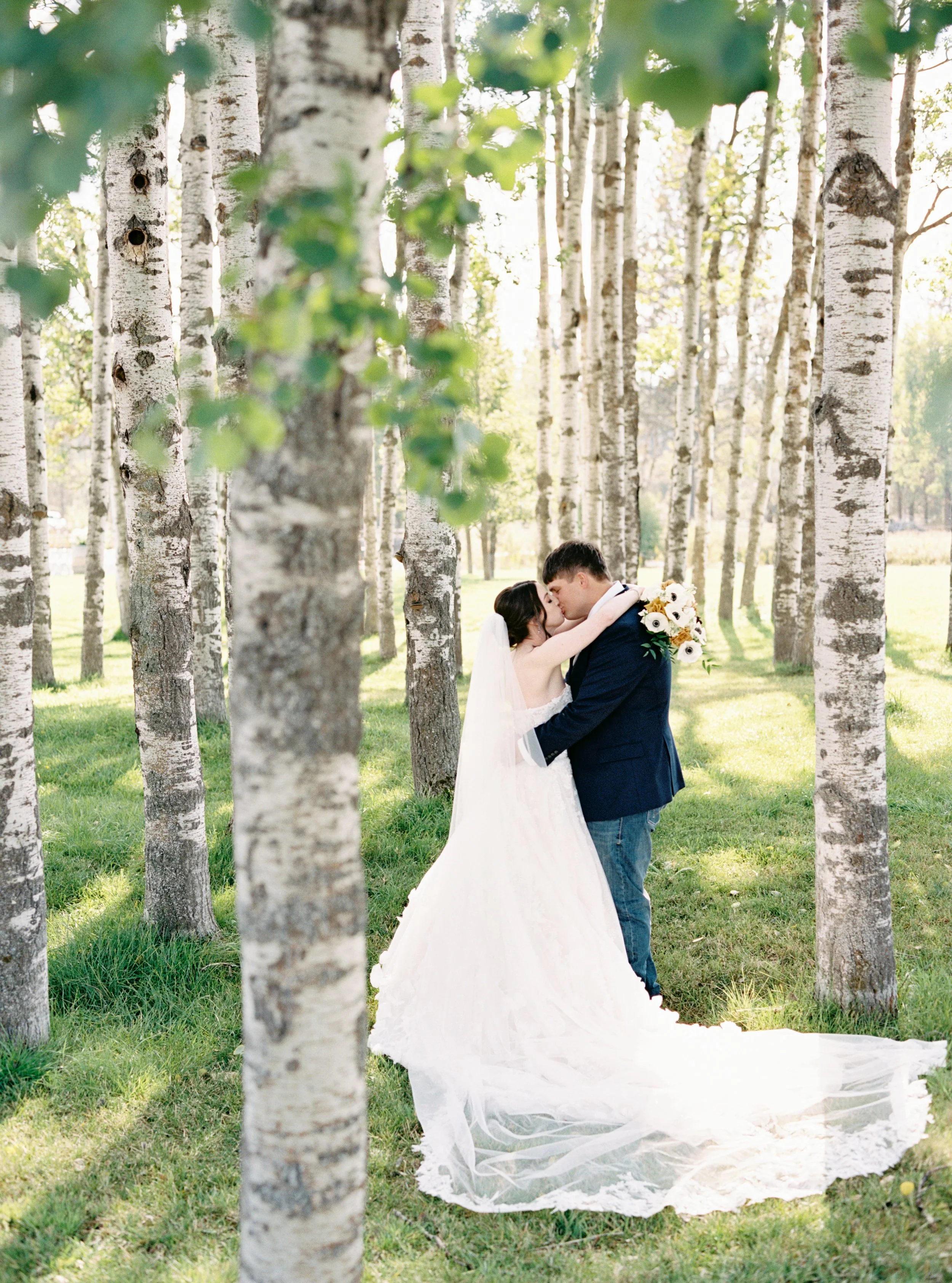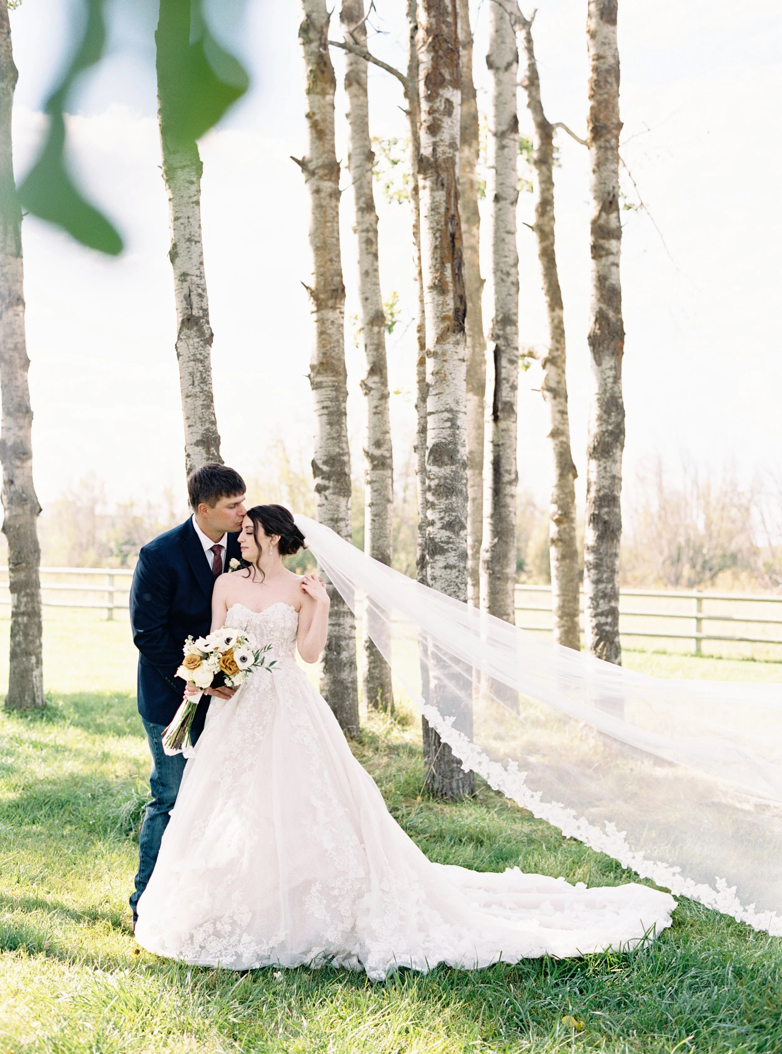 Kelcie wore a stunning strapless gown from Kleinfeld Bridal in New York City, which paired beautifully with the Montana setting. Her dress moved softly in the breeze and photographed beautifully on film during portraits.