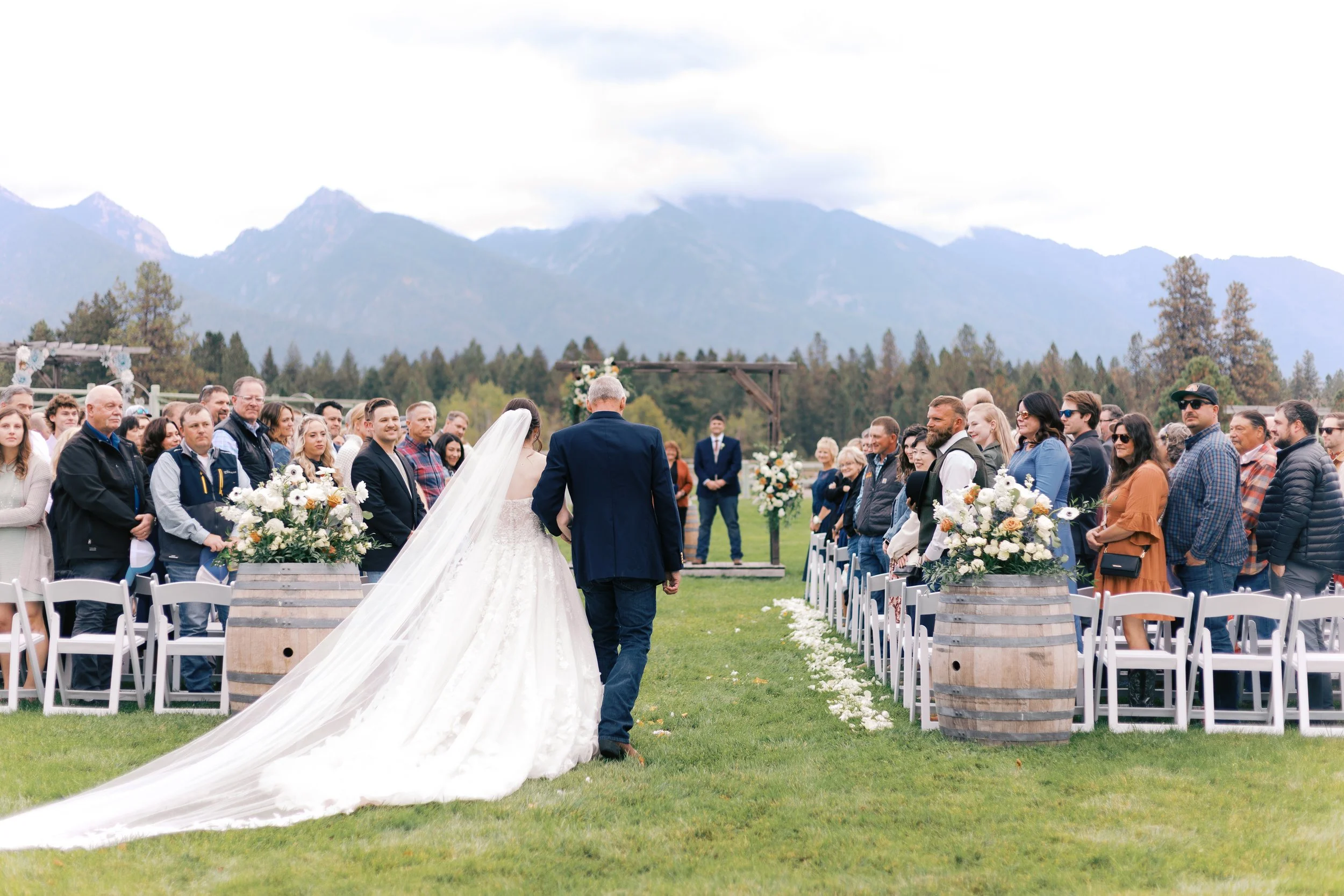 The weather held out in the best way. The rain didn’t arrive until cocktail hour, which meant everyone enjoyed the mountain views throughout the ceremony. Guests moved inside to continue celebrating as the drizzle picked up, and then, in perfect Montana fashion, the rain paused just in time for us to sneak outside for a few sunset portraits. The Mission Mountains peeked through the clouds, the sky turned soft blue pastel.